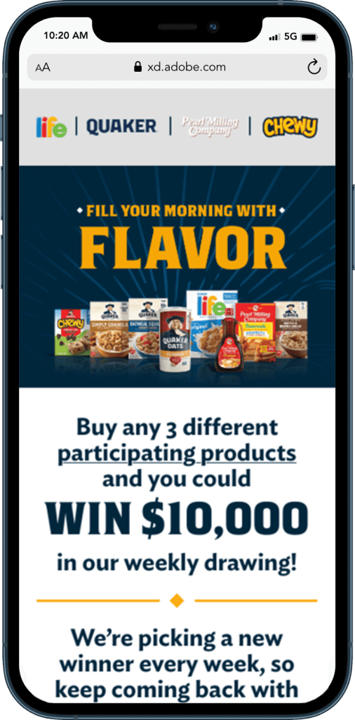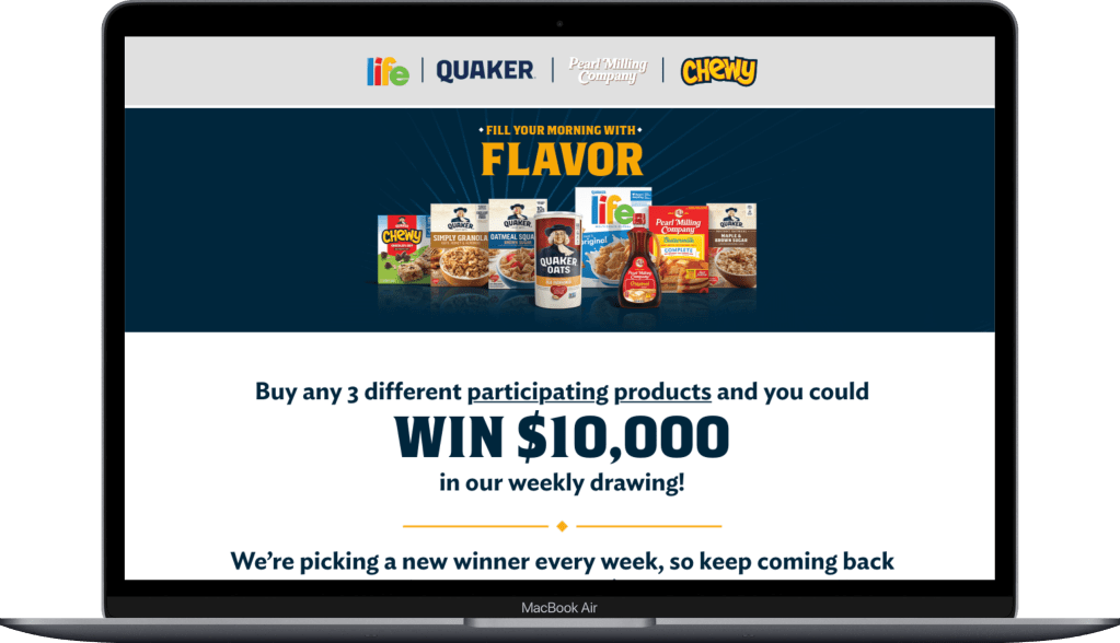 Mechanic: Sweepstakes – Users would buy participating Quaker products, register their information, and enter three UPC codes of participating products. After entering these codes, they would be entered into the sweepstakes for a chance to win $10,000.