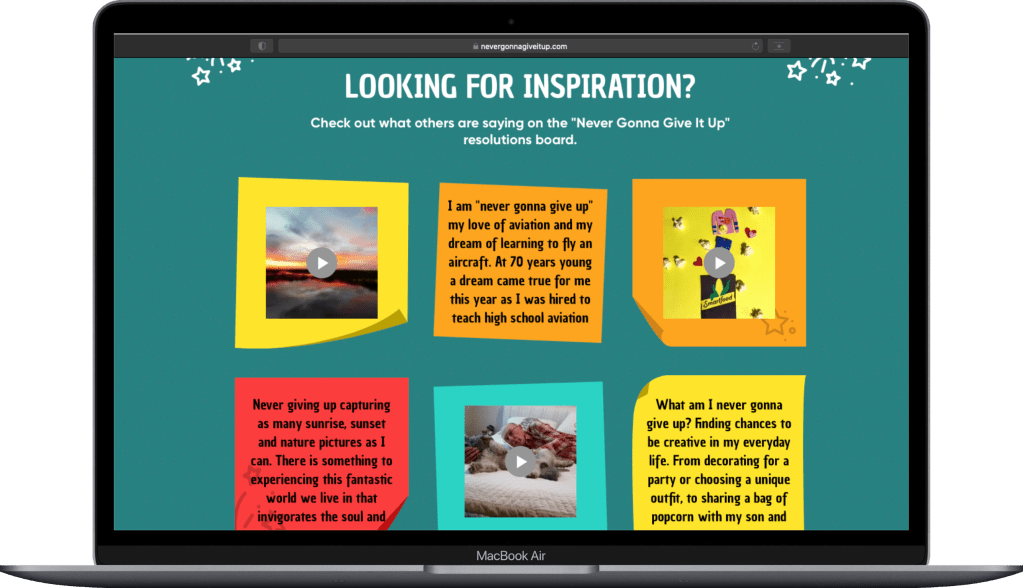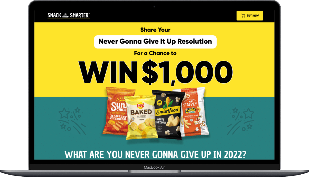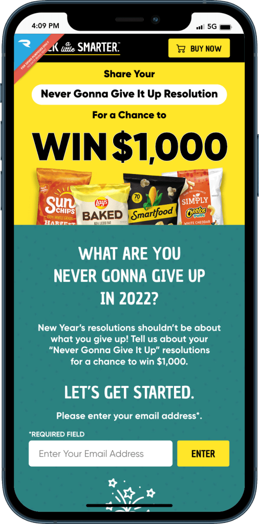 Mechanic: User-Generated Content Contest – After registering, users would submit their resolution of what they are “never gonna give up” in 2022 for a chance to win $1,000. The written response could optionally include a video.