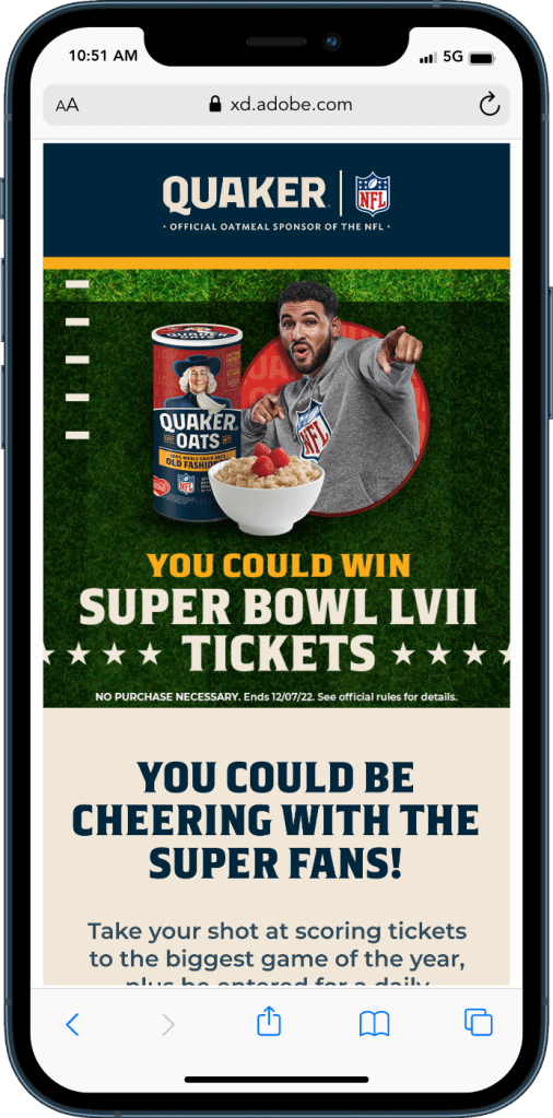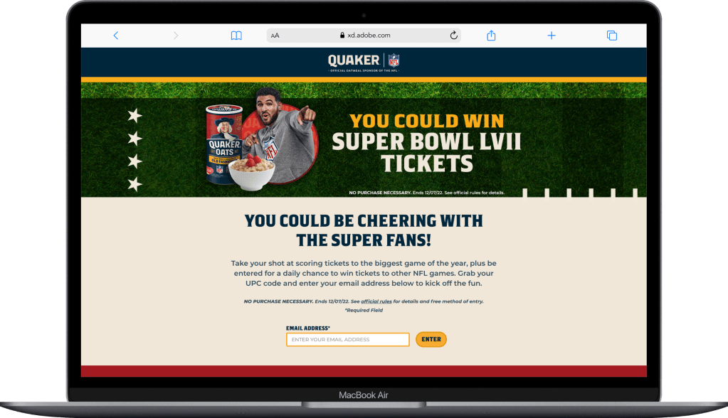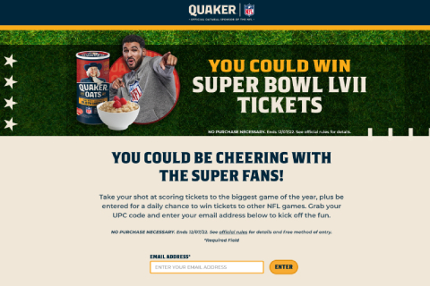 Mechanic: Instant Win and Sweepstakes – Users would buy participating Quaker products, register their information, and enter a UPC code daily for a chance to win. Every day, users had a chance to instantly win two tickets to their choice of one 2022/2023 regular-season NFL game within the United States. If a user entered three UPC codes, they would be entered into a sweepstakes for a chance to win two gran prize tickets to Super Bowl LVII plus round-trip airfare, hotel accommodations, and transportation to the game.