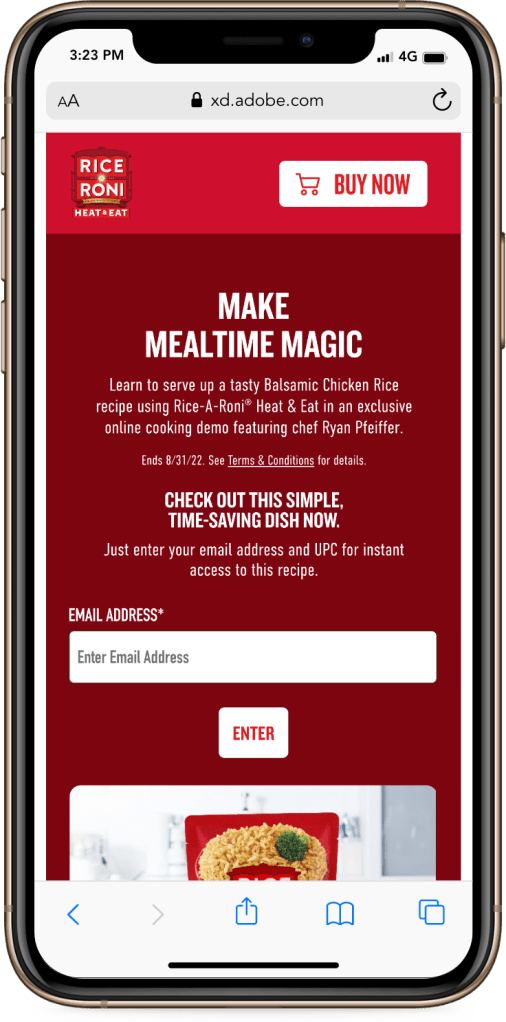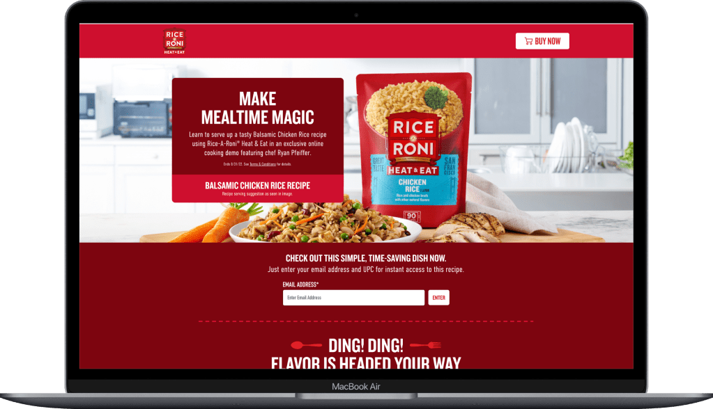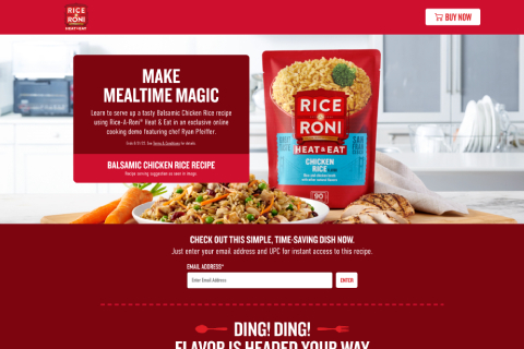 Mechanic: Buy-Get – Users would buy participating Roni Heat & Eat products, enter the UPC code on the microsite, and instantly access an exclusive “Meal Maker” class. The website also included information about the Roni trolley tour with sampling events across the country.